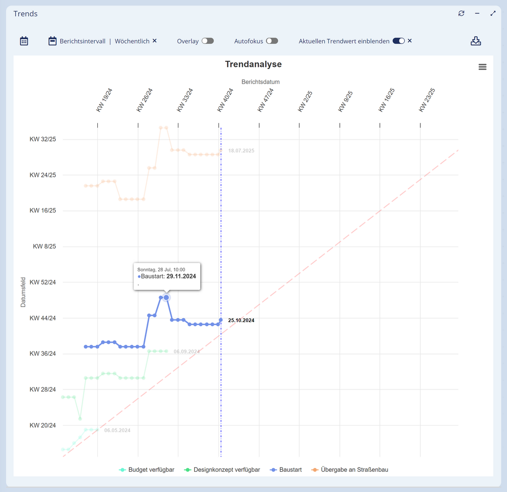 TRENDS hilft dabei, Verschiebungen von Datenwerten zu visualisieren und Entwicklungen in bestimmte Richtungen erkennbar und prognostizierbar zu machen. Nach dem Prinzip einer klassischen Meilensteintrendanalyse (MTA) werden die Verschiebungen über den Projektverlauf hinweg dargestellt. Was auch immer geschoben wird, Sie behalten den Überblick und können Tendenzen erkennen um frühzeitig Maßnahmen einzuleiten.