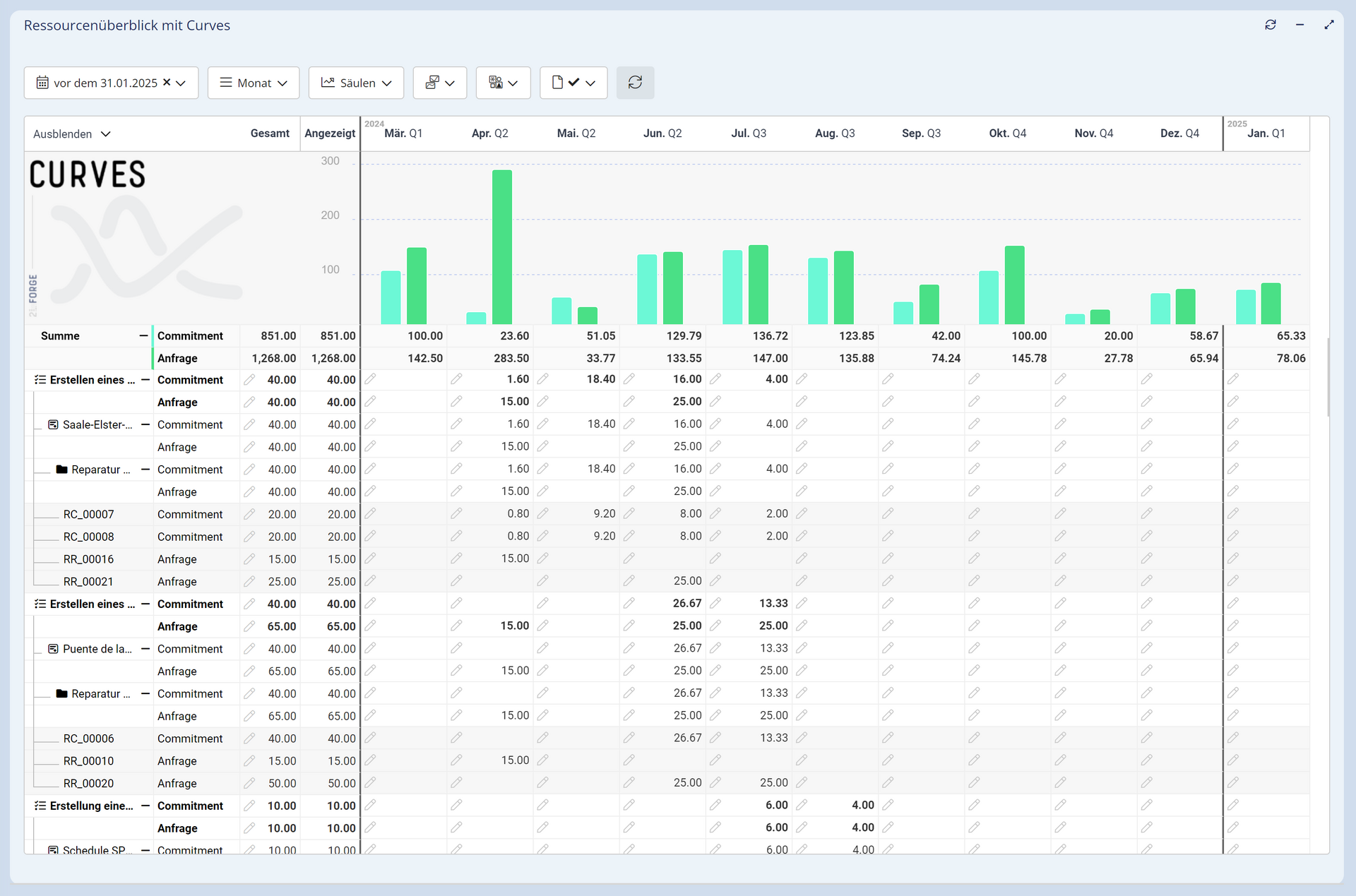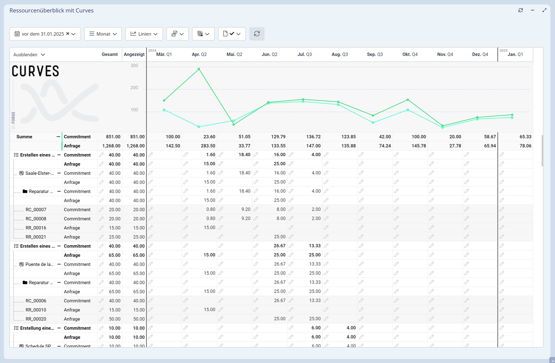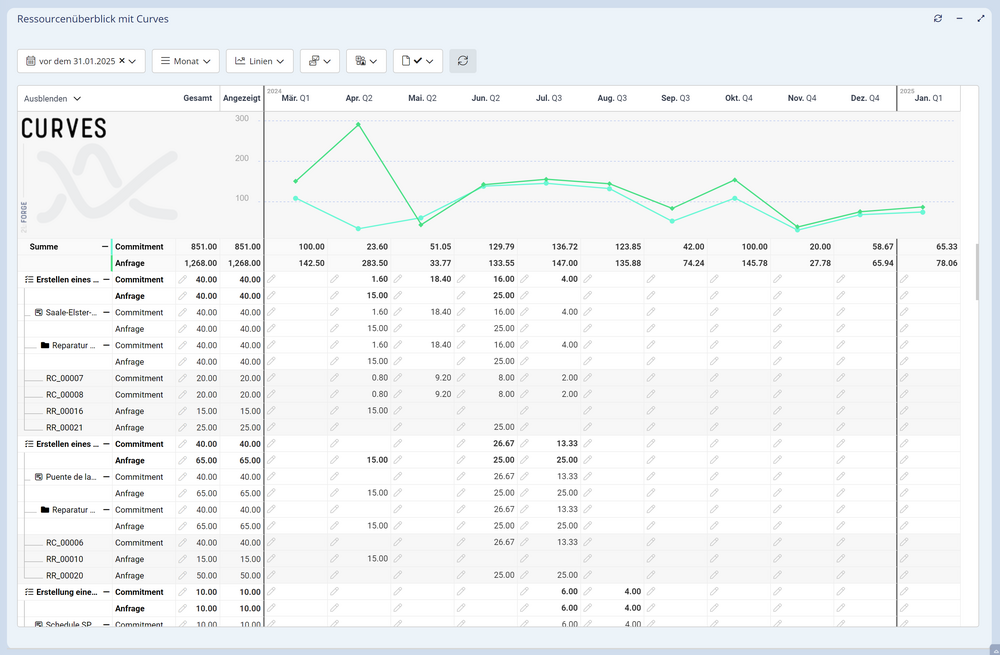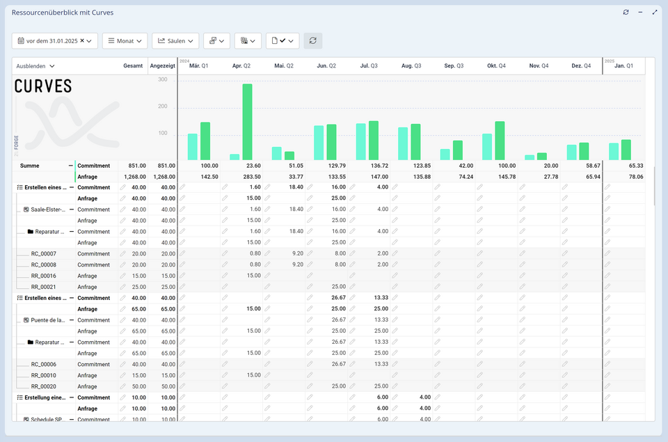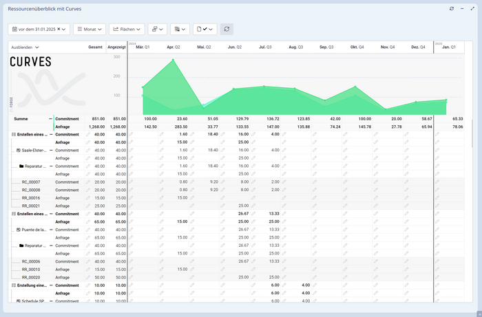 CURVES bietet die notwendige Flexibilität, um verschiedenartige Projektinformationen mit unterschiedlichen Zeitskalen in einer gemeinsamen Auswertung übersichtlich darstellen. Das vielseitige Curves-Widget ist flexibel konfigurierbar. Es lassen sich zeitbasierte Werte grafisch und tabellarisch darstellen und bearbeiten. Die angezeigten Informationen können auf einer individuell anpassbaren Zeitachse nach beliebigen Attributen gruppiert und aggregiert werden. So ergeben sich aus den Rohdaten leicht verständliche Diagramme und Grafiken, was die Interpretation und Präsentation von komplexen Daten erleichtert. Daten können auf einfache Art und Weise gefiltert werden und die Filteranpassungen werden unmittelbar angezeigt.