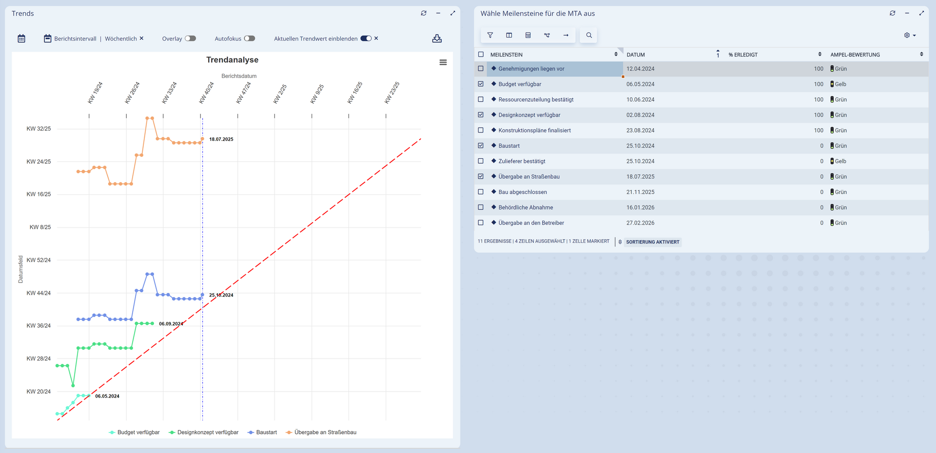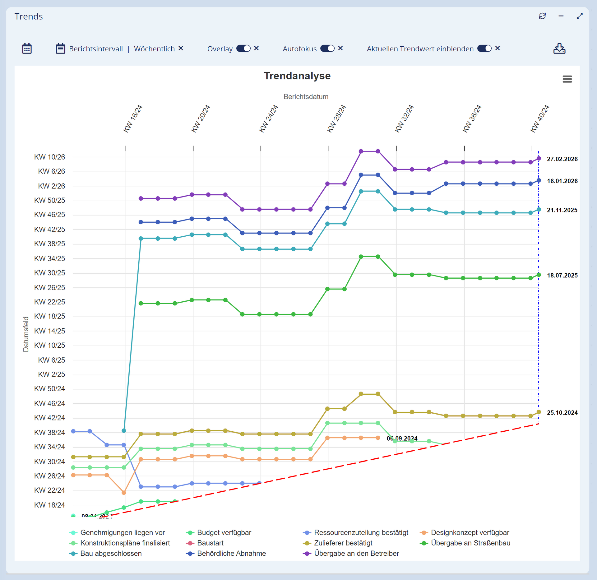 TRENDS hilft dabei, Verschiebungen von Datenwerten zu visualisieren und Entwicklungen in bestimmte Richtungen erkennbar und prognostizierbar zu machen. Nach dem Prinzip einer klassischen Meilensteintrendanalyse (MTA) werden die Verschiebungen über den Projektverlauf hinweg dargestellt. Was auch immer geschoben wird, Sie behalten den Überblick und können Tendenzen erkennen um frühzeitig Maßnahmen einzuleiten.