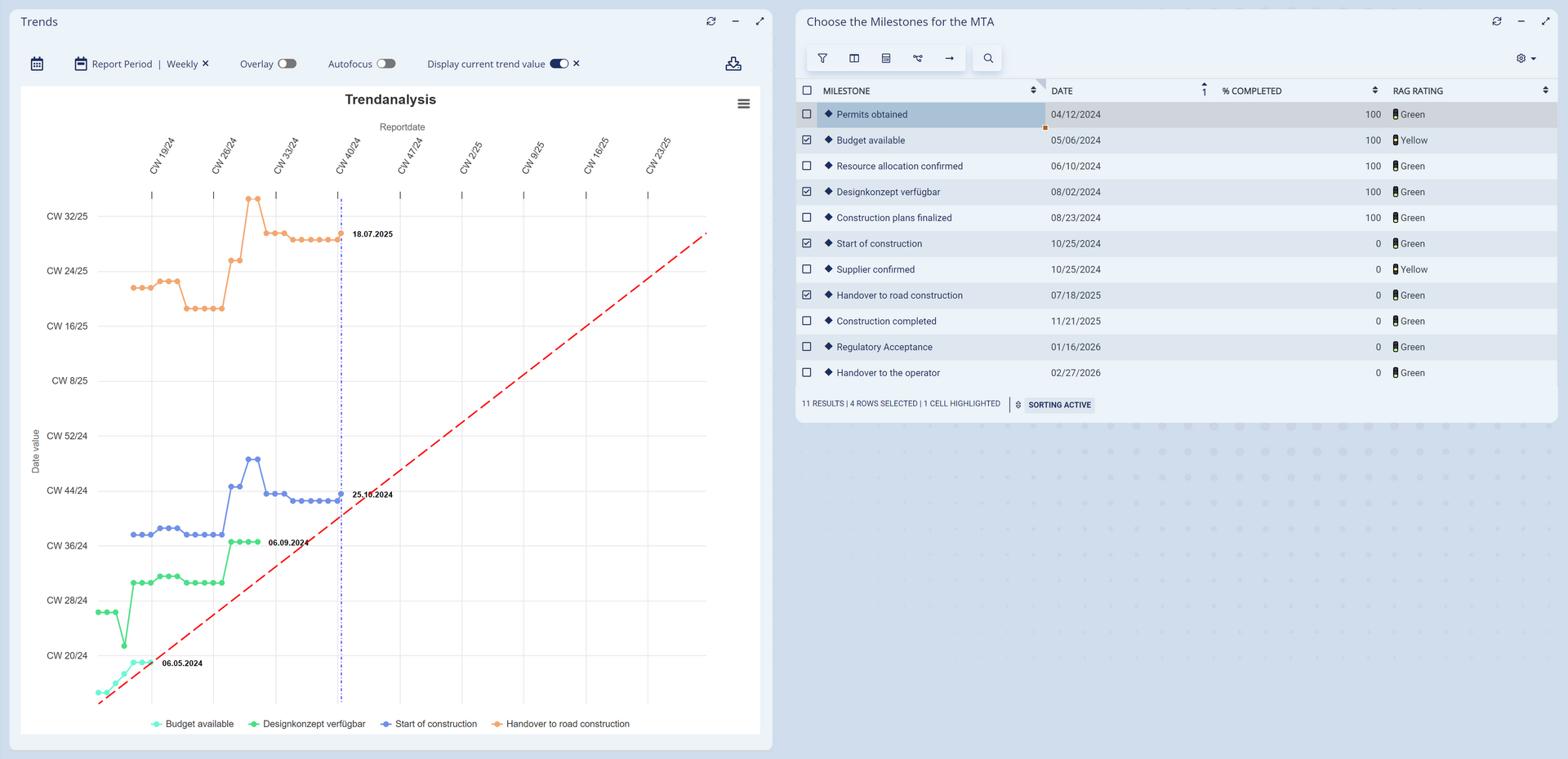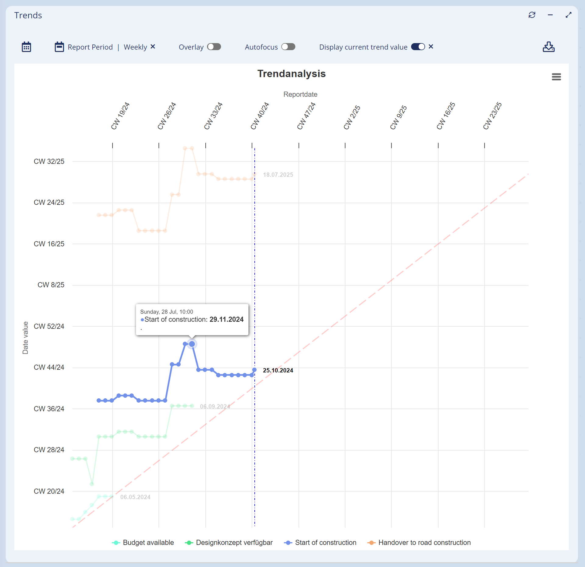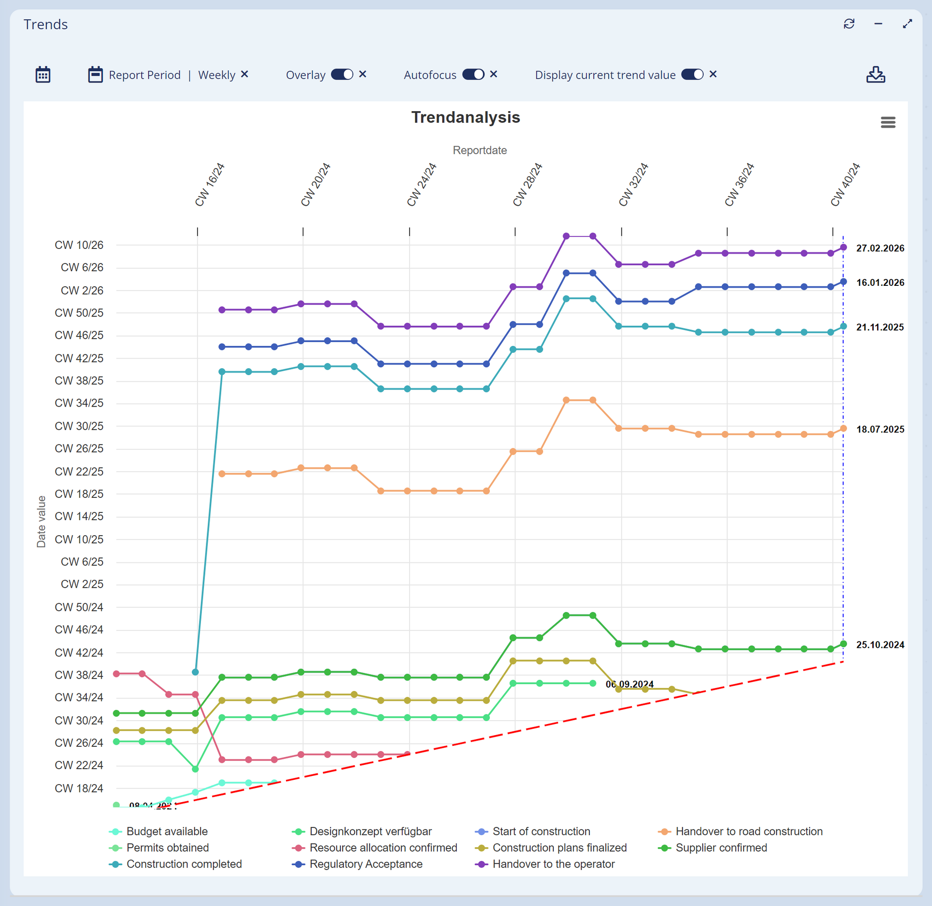 TRENDS helps to visualize shifts in data values and make developments in certain directions recognizable and predictable. Following the principle of milestone trend analysis (MTA), the shifts are displayed over the course of the project. Whatever is shifted, you maintain an overview and can identify tendencies and initiate measures early on.